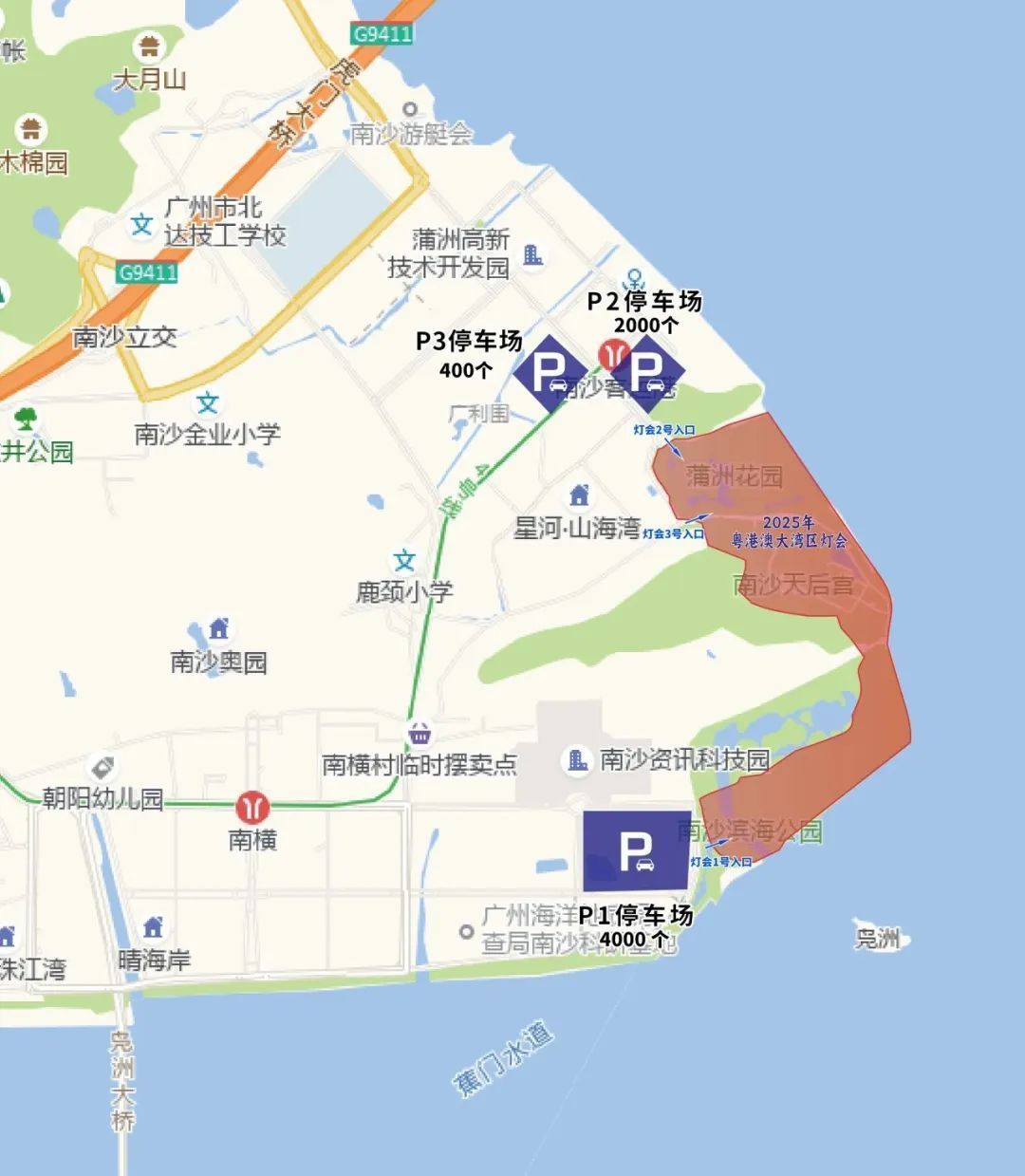 在P3号停车场(近灯会2号售票处):导航目的地设置为“大湾区灯会P3停车场”或“南沙客运港地铁站”,按现场指引停车。【地址:广州市南沙区商贸南2路(南沙客运港地铁站D出口旁)】