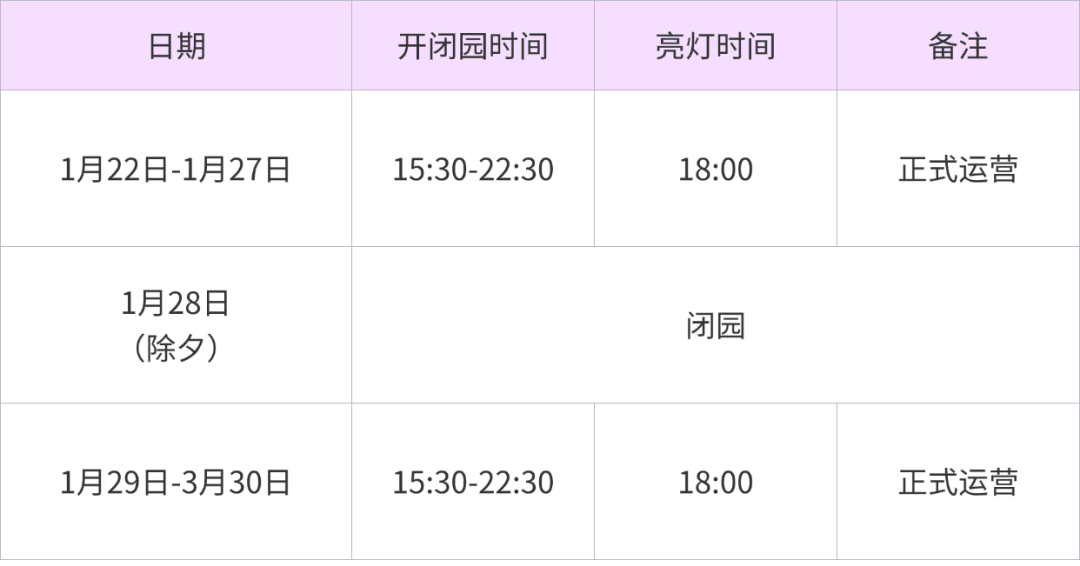 开园时间:1月22日至3月30日,其中1月28日(除夕)闭园休息。