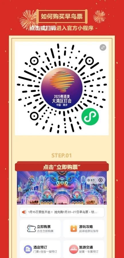 线上购票:在微信搜索“大湾区灯会”小程序预约购票,或直接点击扫描下方二维码进入官方小程序购票,请游客朋友们提前购票,避开高峰时段。