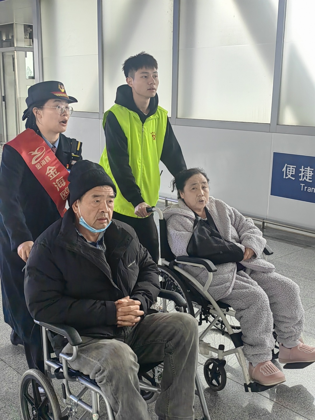 “金海鸥”党员服务队队员协助轮椅旅客进站乘车。