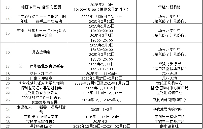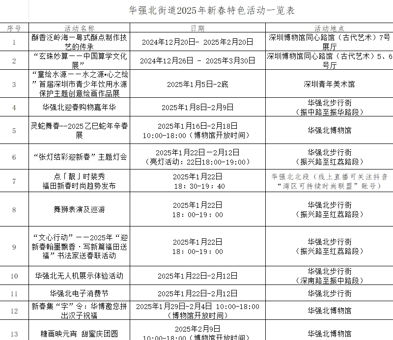 花市花灯“花财蛇”,乐购乐游好惊喜——深圳过年go福田!这里有时尚与传统的碰撞、创意与美好的交融。记者获悉,1月22日-2月12日,欢乐过大年,精彩在福田|“灵蛇献瑞·潮聚福田”——福田区第四届张灯结彩迎新春主题灯会将在华强北科技时尚文化特色街区、香蜜公园闪耀启幕。看花灯、选潮品、写春联、逛市集、看新展……华强北新春活动精彩纷呈,一起来过个科技潮流与现代时尚的新年。