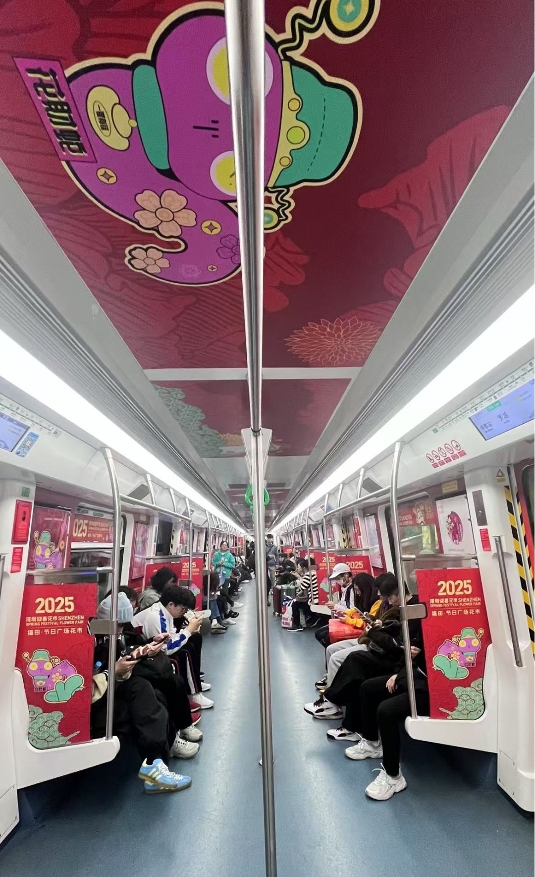 福田•节日广场花市地铁专列车厢以红、金、米三色为主,营造出新春的喜庆。装饰中融入了“花财蛇”和福田“福气家族”两大IP形象。花市花灯“花财蛇”以财神形象与象征幸福的花卉相结合,为蛇年带来吉祥寓意。“花财蛇”不仅在花市中大放异彩,也在地铁专列中延续了这份喜庆,让市民和游客在地铁上就能提前感受到花市的热闹。