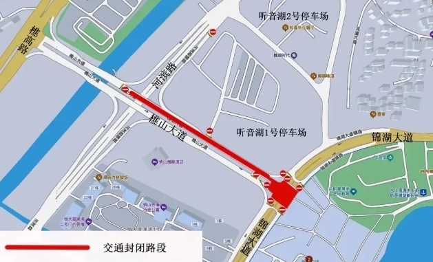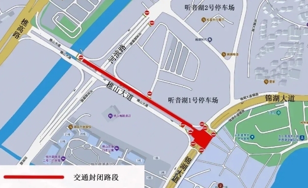 1、樵山大道爱国社区往牌坊方向(寻根树交通灯至河滨路辅道)单边路段实施封闭,禁止车辆从樵高路、河滨路和锦湖大道进入樵山大道。