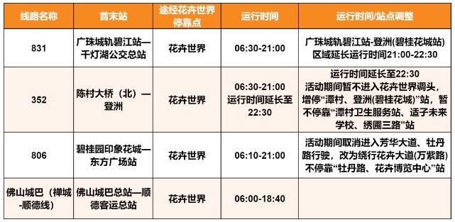 ●常规公交出行:市民可以搭乘831、806、352、佛山城巴(禅城-顺德线)直达花卉世界站进入活动现场。1月18日至27日期间,部分公交线路运行时间和站点有所调整。