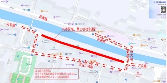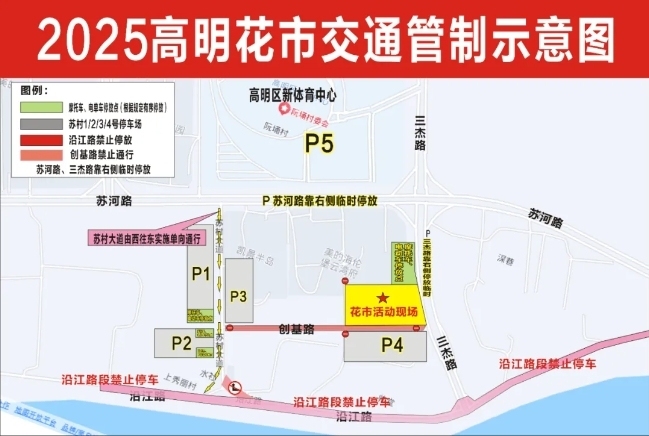 1、创基路(花市活动现场)全路段禁止车辆进入;2、苏村大道实施车辆由西往东(即苏河路往沿江路方向)单向行驶,禁止车辆由沿江路进入苏村大道;3、沿江路除原设有停车位外的路段禁止车辆停放。