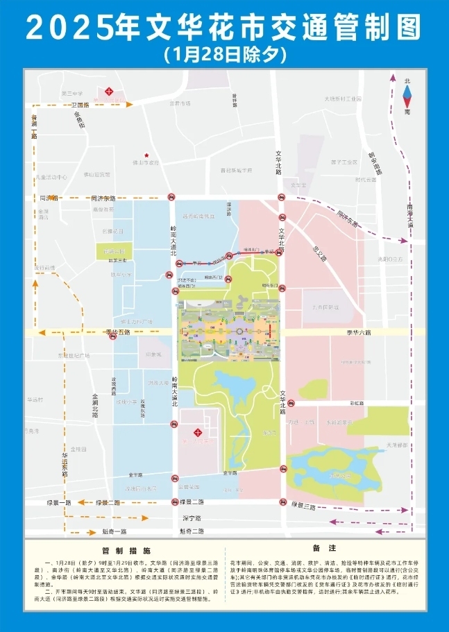 ●1月1日至1月27日,开市期间每天9时至活动结束,文华路(同济路至绿景三路段)、岭南大道(同济路至绿景二路段)根据交通实际状况适时实施临时交通管制,管制期间禁止机动车通行。