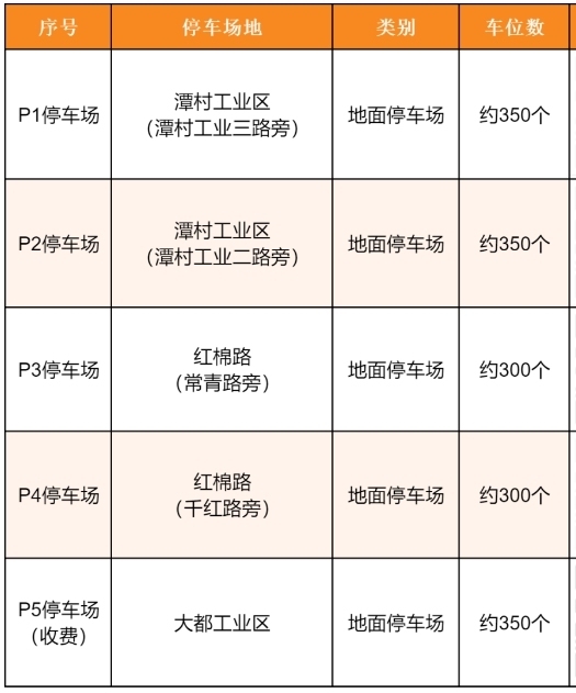设置5个临时地面停车场(P1-P2停车场建议从潭村工业二路进入),提供1650个停车位。
