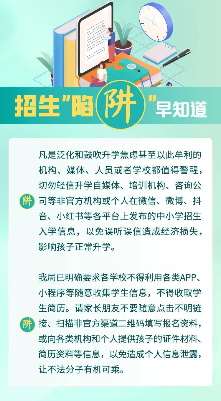 市教育局已明确要求各学校不得利用各类App、小程序等随意收集学生信息,不得收取学生简历。请家长朋友不要随意点击不明链接、扫描非官方渠道二维码填写报名资料,或向各类机构和个人提供孩子的证件材料、简历资料等信息,以免造成个人信息泄露,让不法分子有机可乘。
