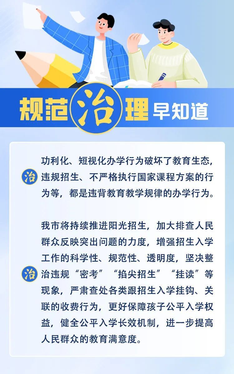 广州市教育局表示,广州市将持续推进阳光招生,加大排查人民群众反映突出问题的力度,增强招生入学工作的科学性、规范性、透明度,坚决整治违规“密考”“掐尖招生”“挂读”等现象,严肃查处各类跟招生入学挂钩、关联的收费行为,更好保障孩子公平入学权益,健全公平入学长效机制,进一步提高人民群众的教育满意度。
