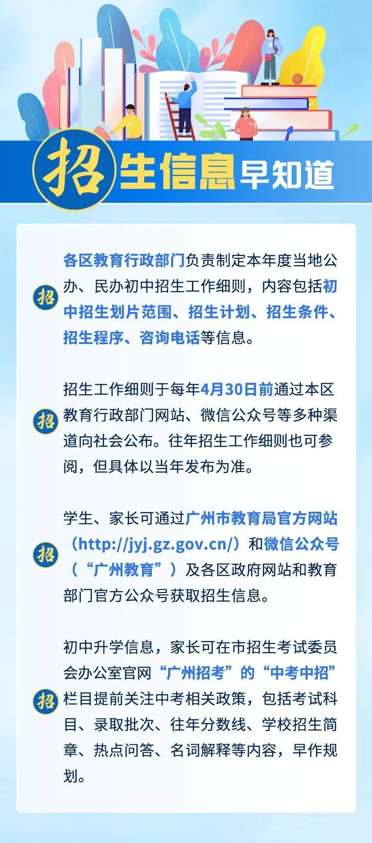 广州市教育局介绍,各区教育行政部门负责制定当地公办、民办初中招生工作细则,内容包括初中招生划片范围、招生计划、招生条件、招生程序、咨询电话等信息。