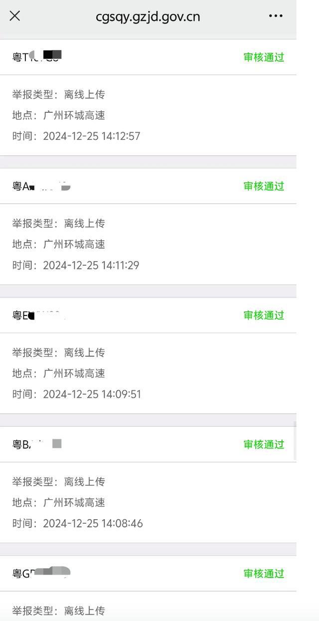 王健:取决于事发地的管辖单位,速度和标准都会有区别。比如高速大队审核,一般1-2天;天河区交警部门审核,一般3-5天,甚至7天。另外,有时会出现一周以上都没有审核结果的情况,根据我的经验,可能是向举报系统传输文件的过程中,信号不稳定导致传输数据流失,审核人员无法在他们后台看到,所以需要重新提交。