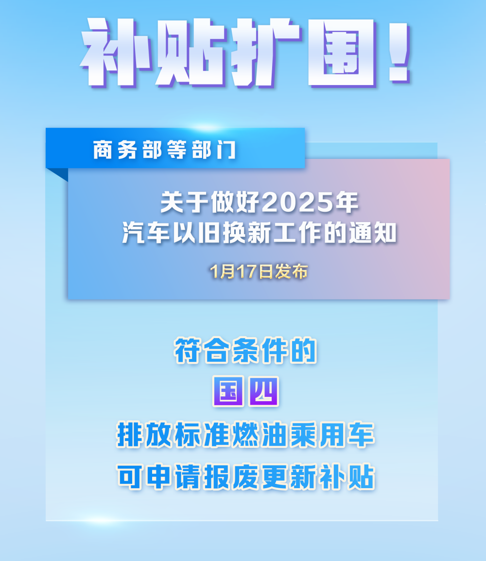 1月17日,商务部等八部门发布了关于2025年汽车以旧换新工作的通知。