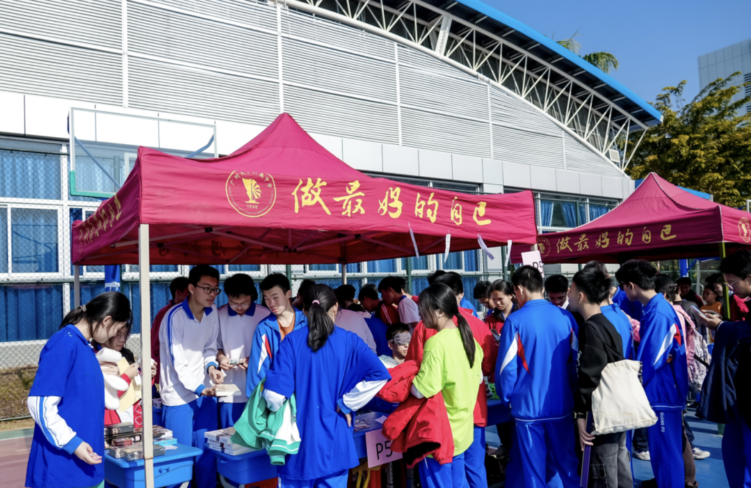 篮球场上,爱心嘉年华义卖活动进行得热火朝天,由该校师生精心准备的手工艺品等各类“商品”吸引顾客驻足挑选。