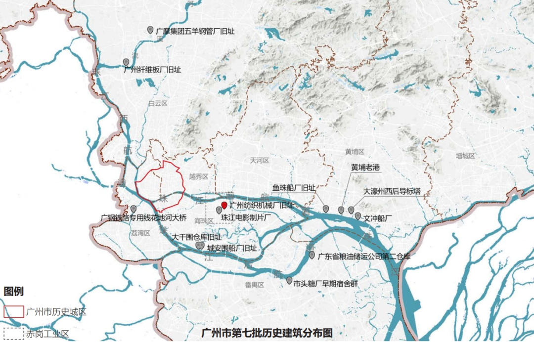 第七批历史建筑在时间跨度上,包括了从民国到改革开放时期的工业遗产,充分体现广州工业发展历程。在行业类型上,涉及船舶制造业、制糖业、电影制作业、交通运输仓储业等多个特色行业,见证广州近代仓储、制造和航运的发展。在地理分布上,13处历史建筑均位于珠江沿岸1公里以内,其中有11处是直接滨水的造船、港航、仓储等工业遗产,体现了广州水路发达,因水而兴的城市特征。