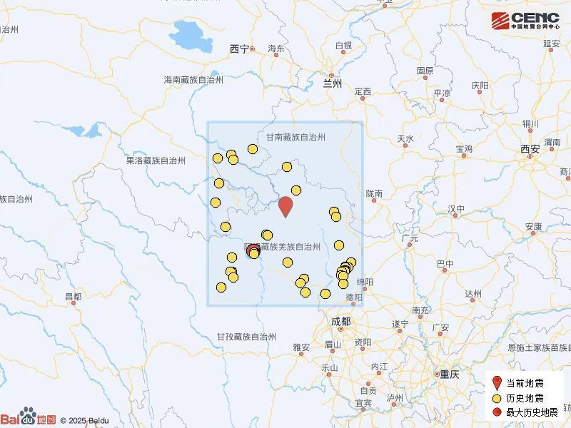 根据中国地震台网速报目录,震中周边200公里内近5年来发生3级以上地震共75次,最大地震是2022年6月10日在四川阿坝州马尔康市发生的6.0级地震(距离本次震中124公里)。