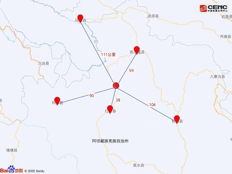 震中距红原县38公里、距若尔盖县59公里、距阿坝县90公里、距松潘县104公里、距甘肃玛曲县111公里,距阿坝藏族羌族自治州141公里,距成都市307公里。