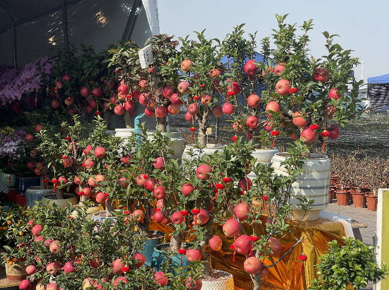 除了年花品种众多,部分档主还从装饰和盆景造型方面入手,在摇钱树或海棠上挂上红色的小灯笼或对联。也有品种不同、颜色不一的蝴蝶兰进行组合搭配,按照高低交错或扇面形排列,结合假石山、青苔、石湾公仔等元素,搭配复古有质感的花盆造型,十分有艺术感。