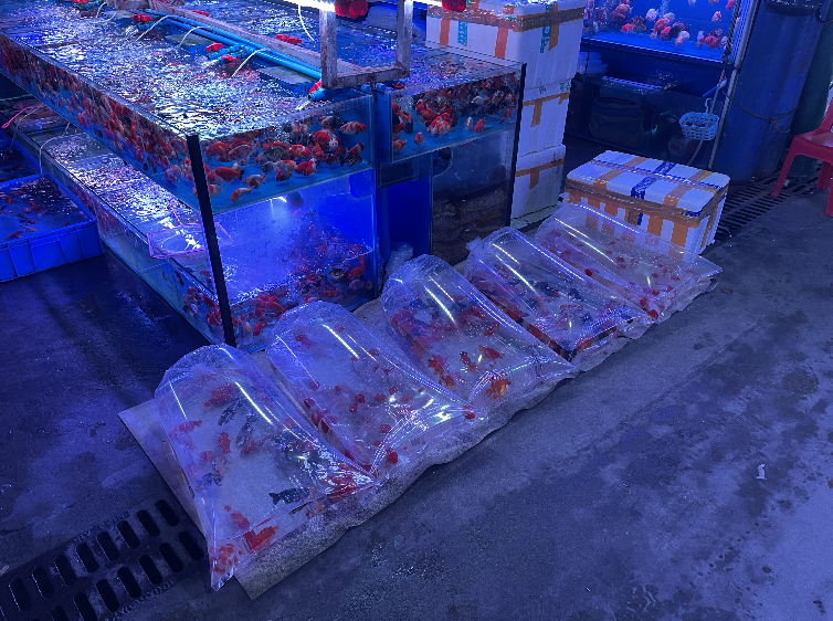 除了逛花市外,不少市民还顺道到旁边的芳村花鸟鱼虫新世界的水族馆、雀鸟区买观赏鱼和萌宠,其中水泡、珍珠、狮子头等品种的金鱼十分“抢手”,价格也十分优惠,一些小型观赏鱼价格低至1元一条。除了单卖外,也有部分商家按照品种打包整袋销售。