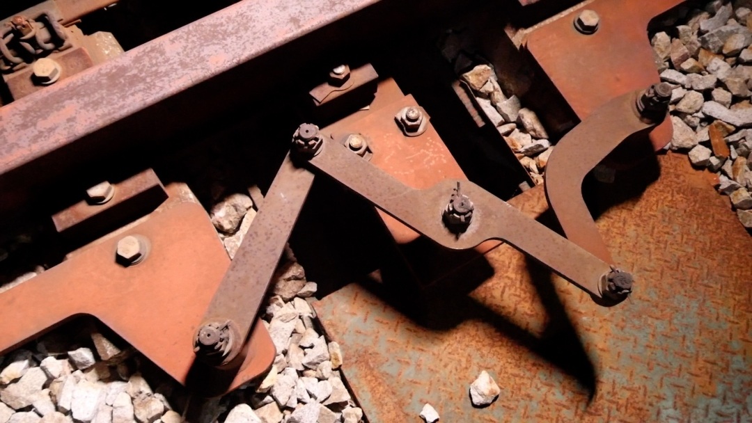 潘圣云推着钢轨探伤仪开始探伤检查。‘温调器’有基本轨、尖轨、扣件系统等多个部件构成。今天晚上检查的钢轨伸缩调节器,是CN-600AB下承式伸缩装置。它在钢轨外侧的固定两根纵向钢梁上,安装一根可滑动钢枕和连杆剪刀装置连接桥缝,标准总长为17200mm。这个铰链一样的结构叫三连杆剪刀装置,俗称剪刀装置,它与桥缝两端的轨枕固定、与可动钢枕相连,可以保证梁缝伸缩过程中节点间距的均匀。