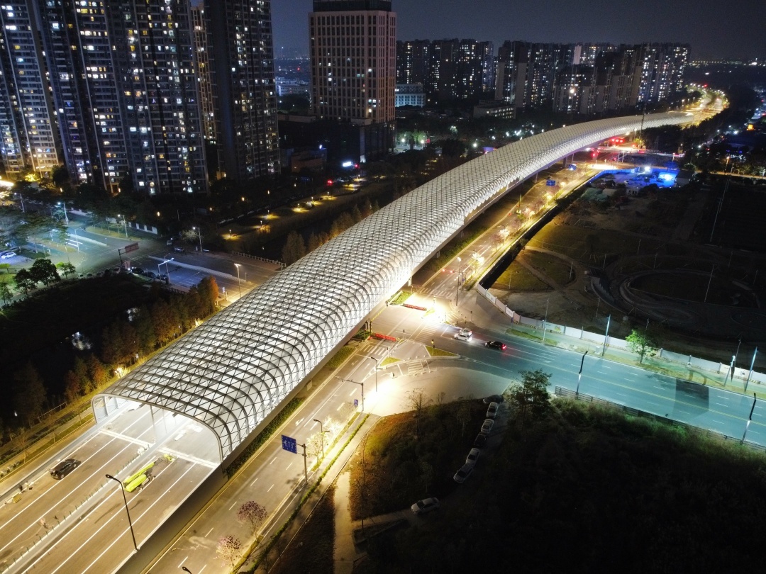 林上路跨线桥是项目的重要组成部分,该处汇聚了多个住宅小区,考虑到交通噪音影响及提高附近居民生活品质,声屏障成为伦桂路工程的核心配套项目。声屏障设计巧妙结合高架桥断面,采用圆弧形断面与菱形网格划分的独特形式,网格内嵌入透明亚克力板。整个声屏障采用4498块总面积达22534平方米的带圆弧菱形亚克力板,进一步提升视觉效果和实用性,具备出色的隔音效果,融合了景观美学设计,成为本地一道亮丽风景线。