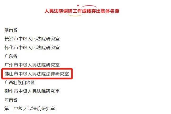 近日,最高人民法院通报表扬人民法院调研工作成绩突出的50个集体及100名个人。佛山中院研究室榜上有名,成为全省仅有的两个入选集体之一。