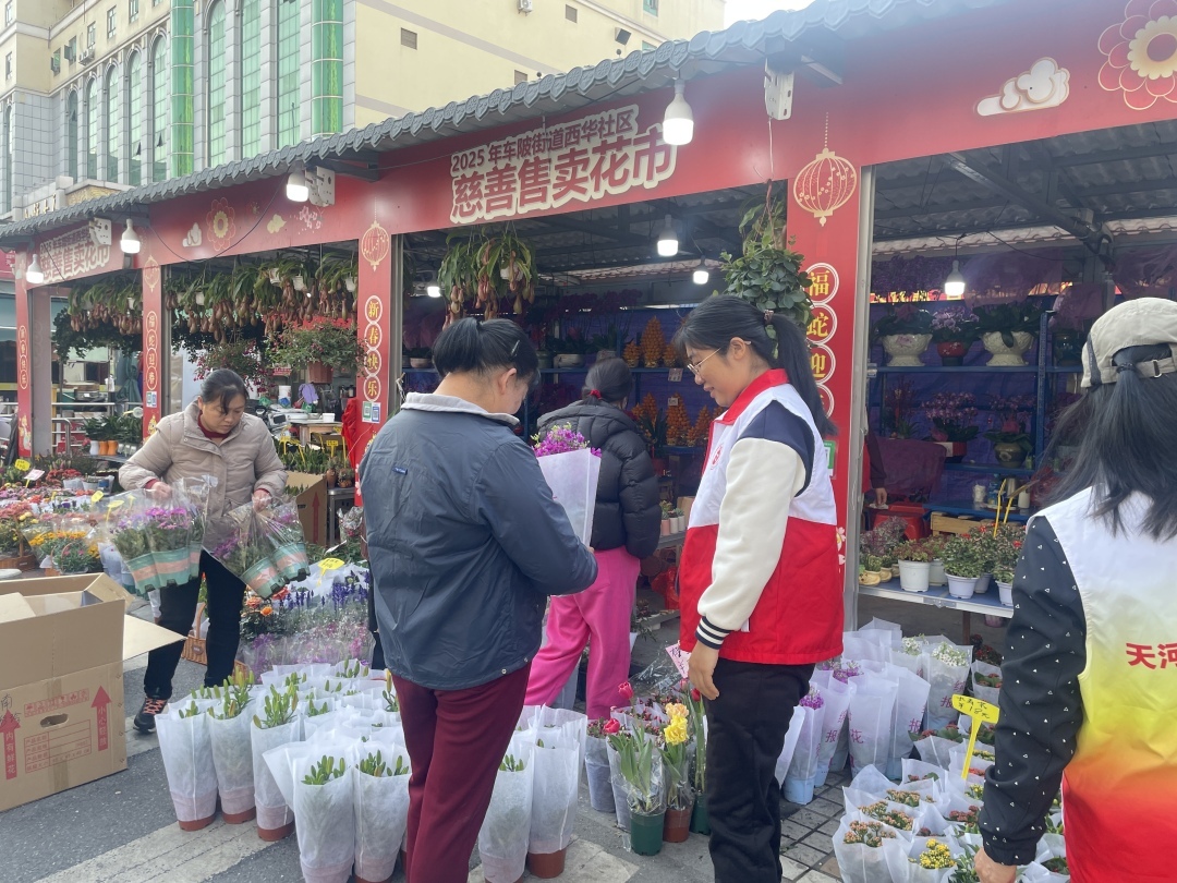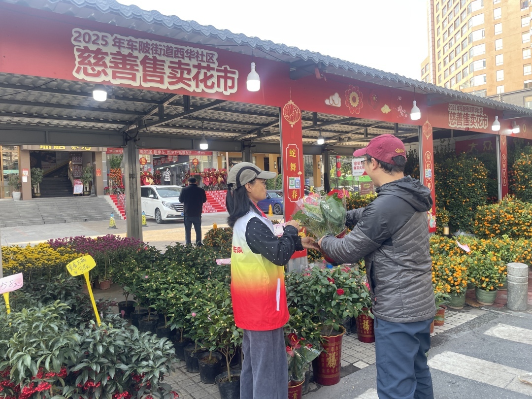 位于天河区车陂街雅景广场的小花市则主打公益慈善。这个花市由车陂街西华社区联合物业公司、年花花商一起组织举办,从1月16日起开市,营业至1月27日,其间每日会将部分销售年花的收益捐赠给西华社区慈善基金,用于社区建设等。