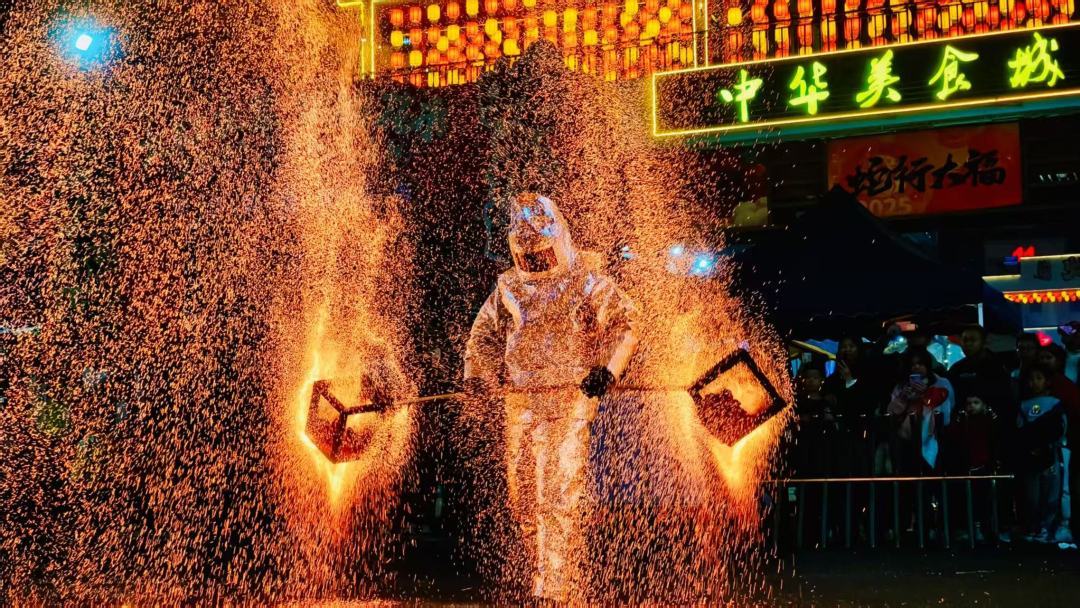 夜幕降临,非遗火壶绝技震撼上演,寓意着驱疾避祸,带来安宁与祥和。只见表演者手持火壶,一抬一抖、一转一舞,火焰瞬间升腾,在夜色中幻化成漫天的“星光”,形成震撼的“火树银花”场面,引得观众阵阵惊呼。“我之前只在视频上看到过火壶表演,没想到这次能在花市现场看到,真是太震撼、太精彩了!”一位市民说。