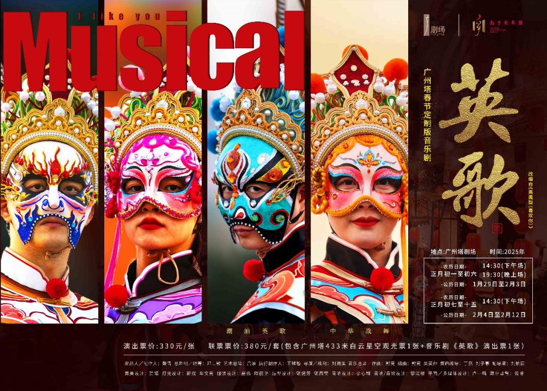 1月29日至2月12日,广州塔剧场将上演春节定制版音乐剧《英歌》,改编自音乐剧《黑鳳梨》(喜欢你)。音乐剧《英歌》讲述的是一个英歌世家的叛逆儿子,回归家族继承传统又破圈发扬英歌舞的故事,不仅仅是传统意义上的“浪子回头”情节,更是当代年轻人内心深处家族和民族血脉觉醒的真实写照,是对传统文化传承和创新的艺术呈现。
