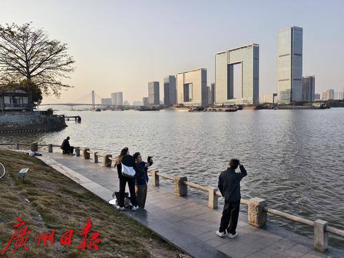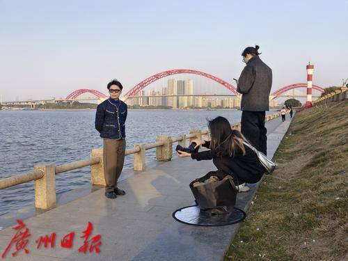 近日,广州天气较为晴暖,有年轻人在珠江边进行人像拍摄。