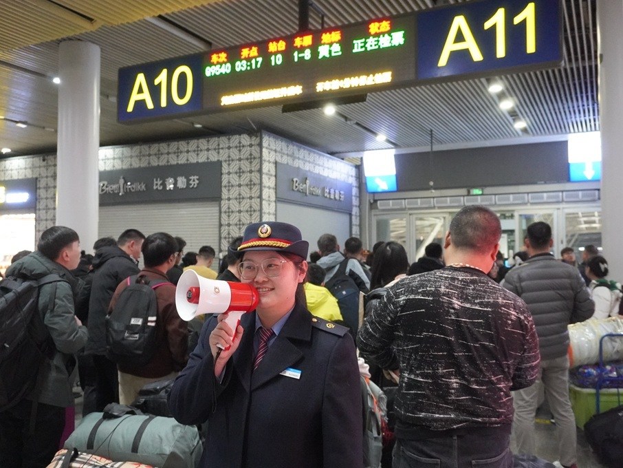 1时9分,A12-13检票口前人头攒动,客运员张玉洁正手持扩音器,用清脆的声音引导旅客有序排队检票。她不时协助老人拿行李,不时提醒旅客注意保管好身份证。在她的有序引导下,检票口前井然有序。