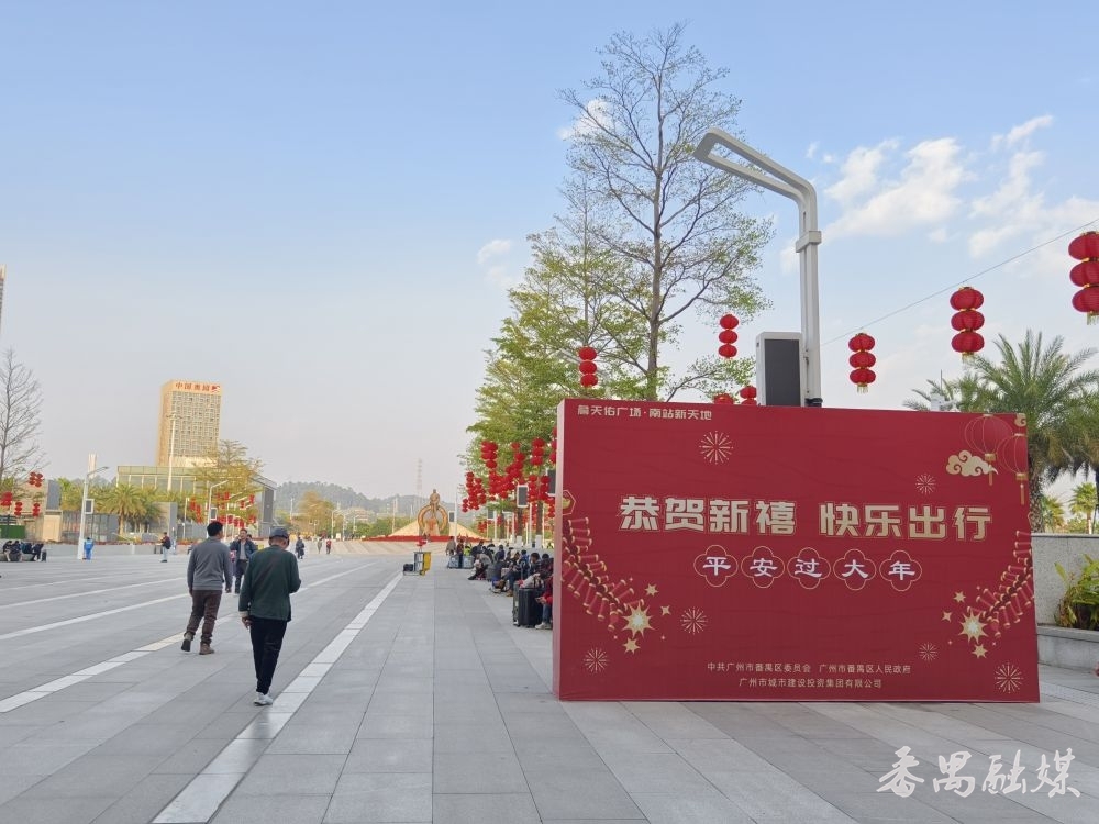 1月21日下午,记者在广州南站看到,从一层的到达大厅到三层的候车大厅、从东广场到西广场,都是拎着大包小包、拖着大箱小箱的旅客。与前几天不同的是,位于南站东门与石兴大道的詹天佑广场拆除了部分围蔽物,有不少旅客坐在广场上休息或在广场内走动,有的旅客在詹天佑纪念像下拍照留念。身穿制服、佩戴红袖章的安保人员在广场上巡逻。詹天佑广场的环境面貌也焕然一新,绿化树上挂着一串串红灯笼,花坛里更新了时花,地面整洁,增添了几分节日的喜庆气氛。“我们在候车的时候很焦虑,心里很闷,能在这么大的广场上走一走,开阔了视野,心里也就舒服了很多。”一位旅客说。