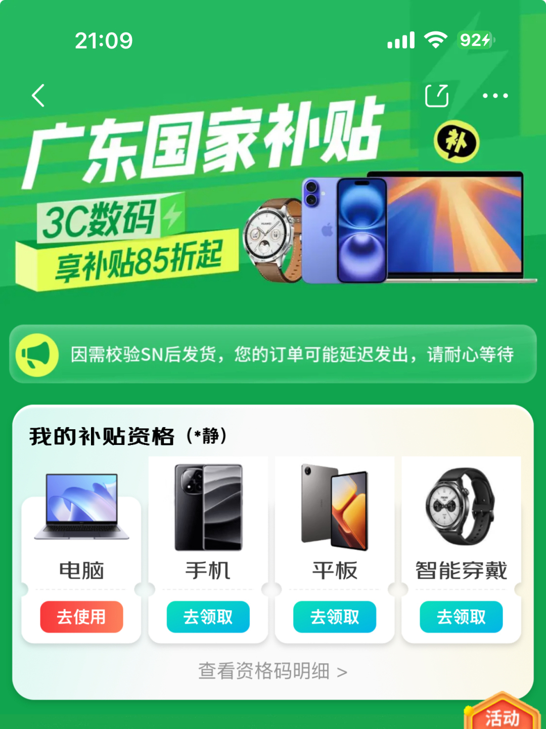 如何领取?消费者只需打开App,搜索“广东3C国家补贴”进入活动会场,找到“资格领取”入口进行领取。领取后,可在京东活动会场浏览选购,也可直接搜索符合要求的商品,享受补贴。