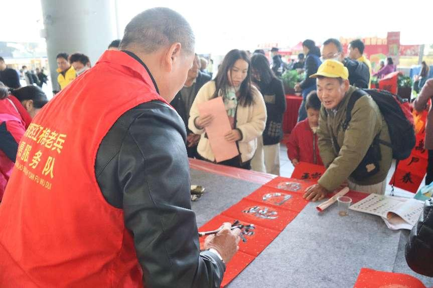 在广州南站,番禺区多名退役军人参与各项工作,为乘客提供周到的出行服务。在志愿服务队伍当中,既有经验丰富的红棉老兵张玉堂、梁健强,又有刚退役的红棉老兵区骏勇。本次活动还邀请到擅长书法的红棉老兵简锦平,为乘客们书写春联。“新春大吉”“万事如意”“平安喜乐”,乘客们精心挑选心仪之作,将来自广州的祝福带回家乡。“春运期间,我们积极参与到保安全、护平安的春运工作中,为广大游客和归家游子提供帮助,让他们感受到回家的路就是最美的风景。”张玉堂谈道。