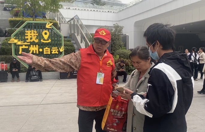 “前面直走就是白云站进站口,您可以查看手机购票记录,里面有显示候车地点,请在上车前一小时进站候车。”在广州白云站西广场,荔湾区红棉老兵汤锦彪正为乘客提供进站乘车指引。作为参与过多年春运志愿服务的志愿者,汤锦彪对于志愿服务工作已熟稔于心。提供购票指引、分享便民信息、指引乘车路径……他耐心细致地回应着广大乘客的需求,让他们的归家路变得更轻松。