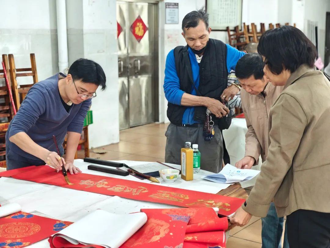 近日,大石街书画艺术协会会长郭灿辉参加多个村(社区)的挥春活动,免费为街坊写春联。临近春节,郭灿辉也会为自己家专门写一副春联,并在除夕当天贴好。