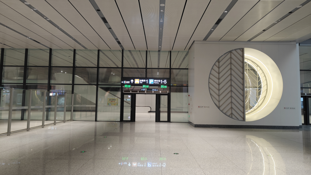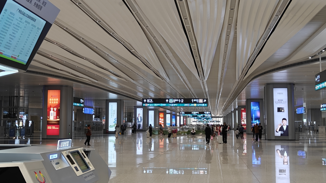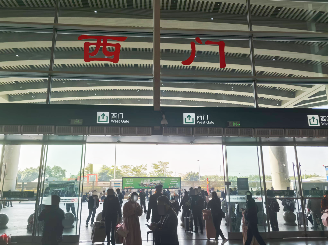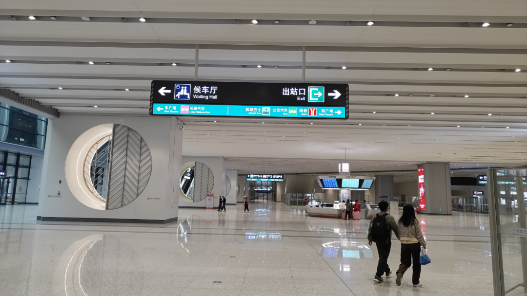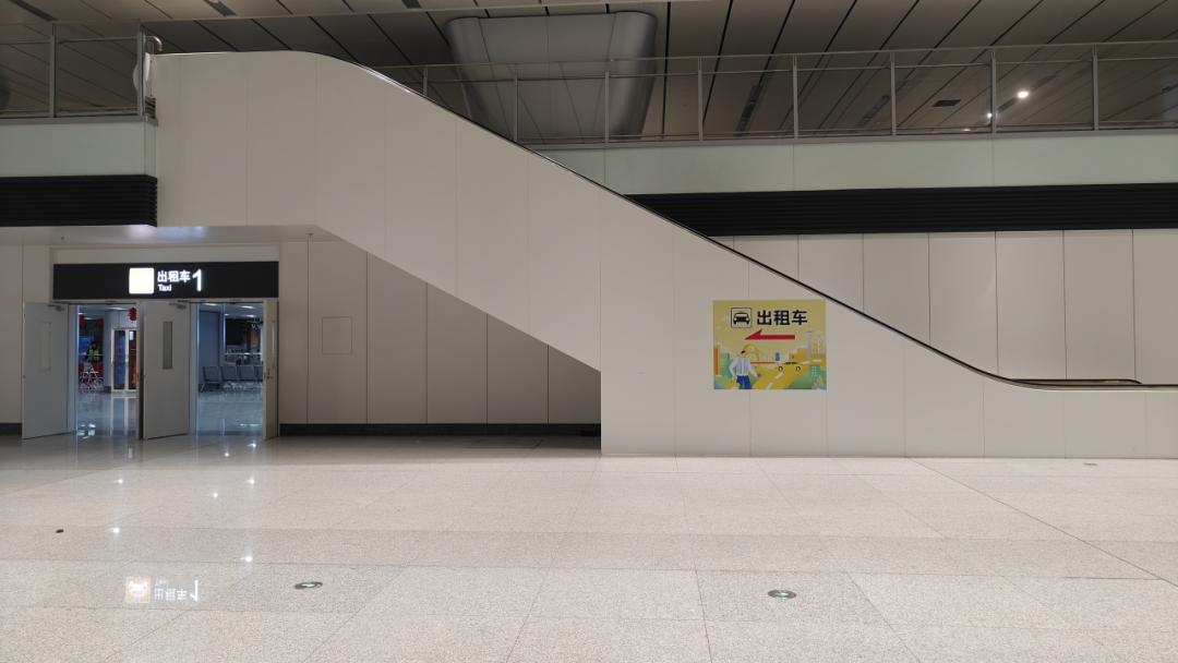 广州白云站分别设出租车上客点、网约车上客点各1个,2个上客点相邻,其中出租车上客具体指引路线如下:从到达层沿出站口方向出站(图27),沿出站口方向右转后直行(图27)约50米,看到指引牌后(图28)转右,继续直行约80米穿过出租车场指引门(图29),沿着指引直行即到达出租车上客区(图30),继续直行约20米即可到达网约车上客区。