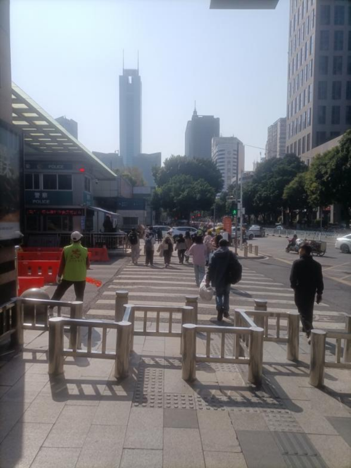广州火车站设有1个出租车上客点,位于中广场外环市中路边。具体指引路线如下:出站后,沿出口方向直行(图16)约90米至广场边缘靠近马路边位置,到达人行道(图17)转左,继续直行约80米到达广场派出所岗亭,右侧即为出租车排队通道(图18)。
