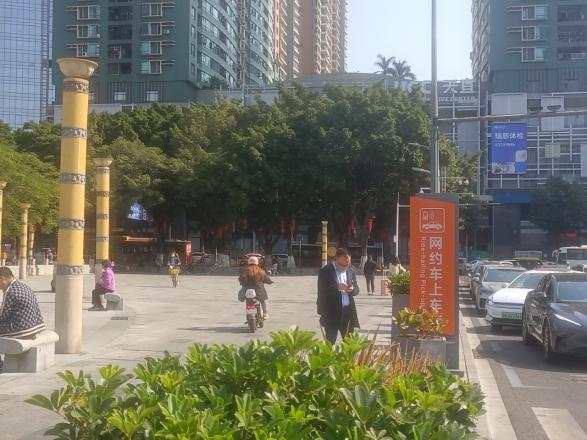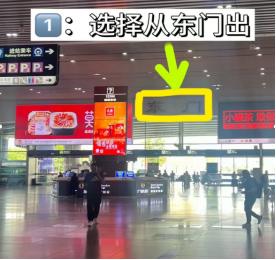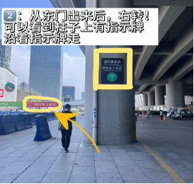 广州南站设有3个网约车上客点,分别为P1停车场、P5停车场、东广场等3个,其中东广场上客点场地最大,交通顺畅,建议推荐此网约车上客点,具体指引路线如下:从东门出站后,沿出口方向直行(图12)约20米,到达最前方柱子后(图13)转右,继续直行约80米到达东广场网约车上客区通道,沿着雨棚通道(图14)直行到底即到达东广场网约车上客区(图15)。