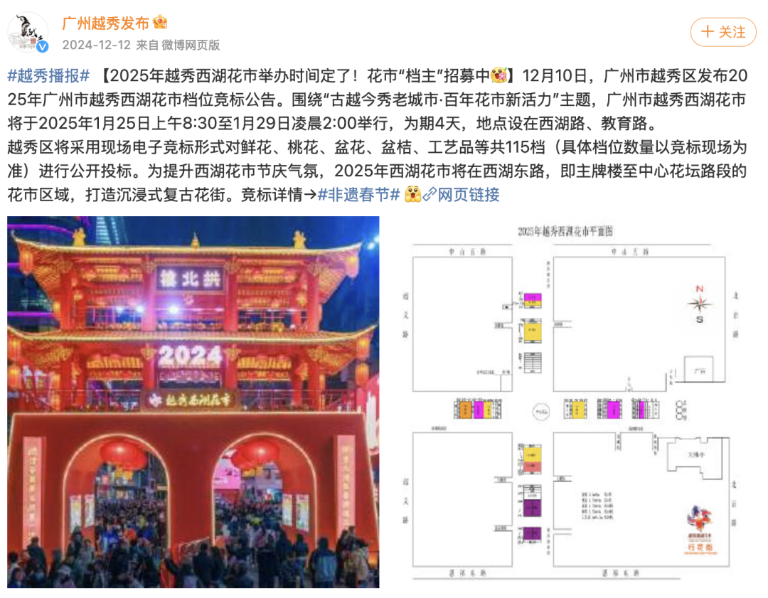 2024年12月4日,“春节——中国人庆祝传统新年的社会实践”列入联合国教科文组织人类非物质文化遗产代表作名录。“广州越秀发布”微平台聚焦社会关切与本土市民情感共鸣,为2025越秀西湖花市开展系列预热宣传:以越秀西湖花市亮相中国春节申遗官宣短片、越秀区国家级非遗项目“春节(行花街)”出现在“春节”申遗文本为引,详述西湖花市及“行花街”习俗的历史与内涵,通过具有感染力的视频与图片,展现百年花市的蓬勃生机;结合2025越秀西湖花市筹备进展,公告花市举办时间、地点、亮点,及时发布花市档位招标、竞标结果、志愿者招募等信息,提高市民期待感;在线征集市民对西湖花市的建议,从现场布置、活动设计、市民互动等方面为西湖花市提供参考,营造与市民共筑花市、共享春韵的融洽氛围。