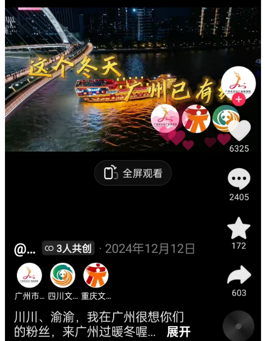 12月12日,“广州市文化广电旅游局”发布视频《川川、渝渝,我在广州很想你们的粉丝,来广州过暖冬喔》,联动四川文旅、重庆文旅发布共创视频,在三地本土广为认知的方言歌曲中,介绍广州的广州塔、珠江琶、太古仓等,四川的火锅、东坡肘子、豆瓣鱼、夫妻肺片等天府旅游美食,以及巴山大峡谷、四姑娘山、光雾山、峨眉山等知名景点,重庆的洪崖洞、李子坝轻轨、解放碑等三地知名文旅资源,进一步深化与重点客源城市的交流,推动文旅产业发展。目前,该视频转评赞累计超万次,带动“广州市文化旅游广电局”位居本月广州市政务抖音第四名。