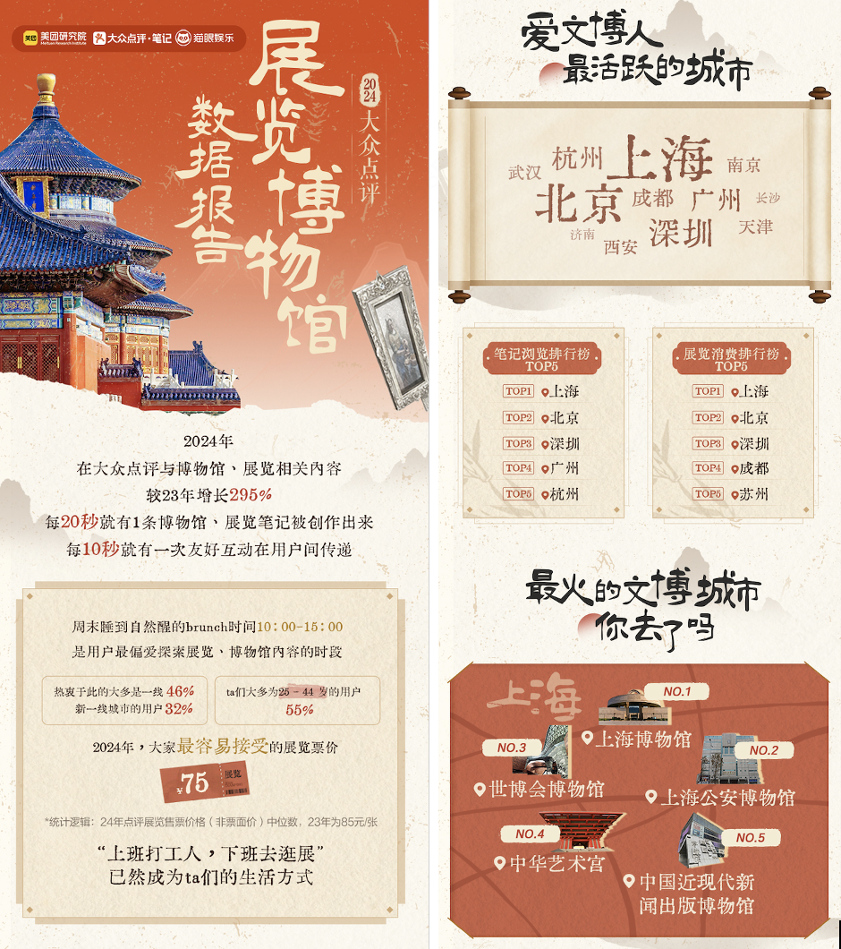 据了解,在大众点评笔记频道,展博笔记浏览量TOP5的城市分别为上海、北京、深圳、广州、杭州;展博消费力TOP5的城市为上海、北京、深圳、成都、苏州;上海博物馆、中国国家博物馆、深圳博物馆、广东省博物馆等展博场馆最受平台用户欢迎。