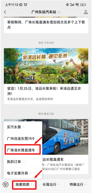 旅客们可以通过关注“广州东站汽车站”微信公众号,选择“我要购票”中的“广珠清长隆直通车”购买车票。