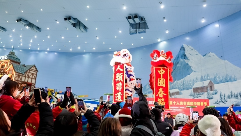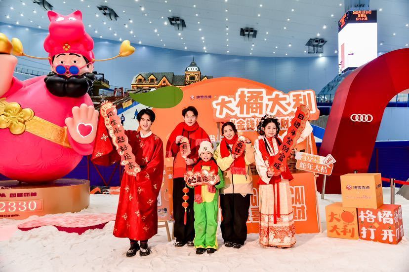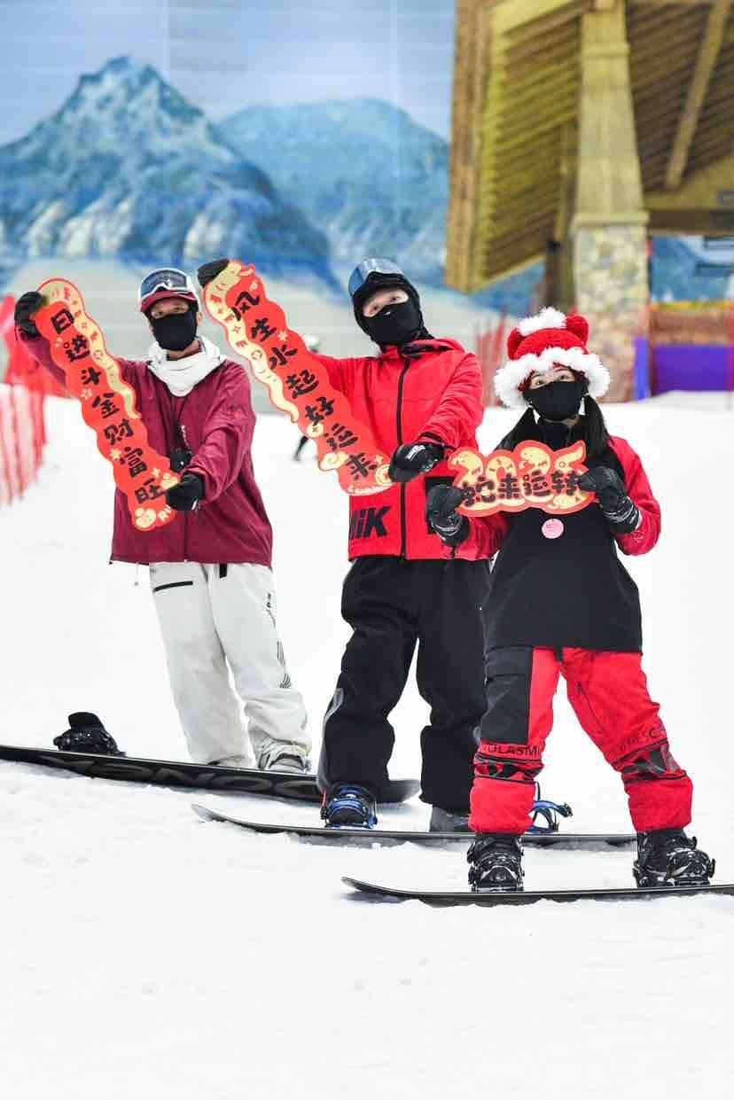 走进零下6度的室内专业雪场,巨型四喜财神IP伫立于雪场中央,与财神击掌即可获一张好运卡,收获新年好运财运;娱雪区万支玫瑰簇拥的超大滑梯和百米花海雪圈,从顶端飞驰而下,刺激十足,还能组队玩千人雪合战冰雪游戏,参加全家敲冰祈福活动赢礼品,为新春增添更多惊喜与欢乐。现场还布置了瑞雪红墙桃花的国风场景,浪漫飘雪营造出如梦如幻的氛围,吸引众多游客驻足拍照打卡。