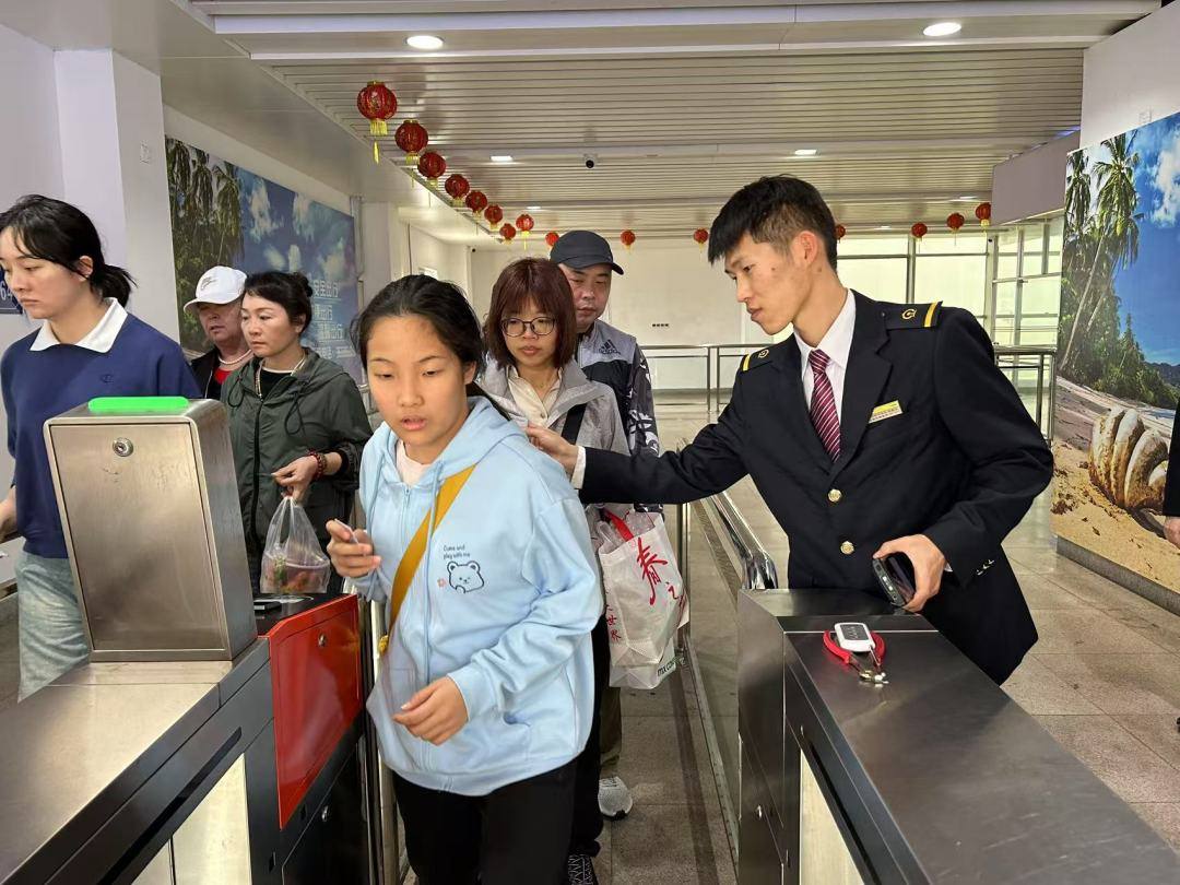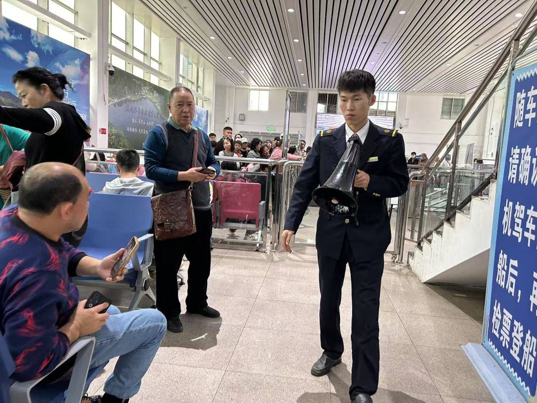 “您好,请照看好身边的小孩,客运护栏禁止攀爬”,“您好,客运站禁止吸烟”,“您好,请有序排队进站,不要拥挤”粤海铁路(现称:海南铁路)徐闻北港的任新江向旅客不停地提醒着。