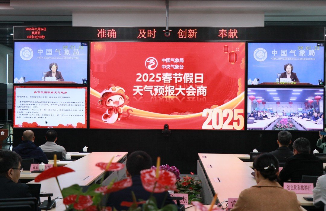 各单位专家认真听取中国气象局2025年全国春节假日天气大会商及华南区域气象中心汇报的主要内容,详细了解春节假日期间全国及华南地区天气情况、可能出现的灾害性天气及其对旅游、交通、卫生健康、环境、电力通信、森林防火、农业等的影响分析和对策建议等。