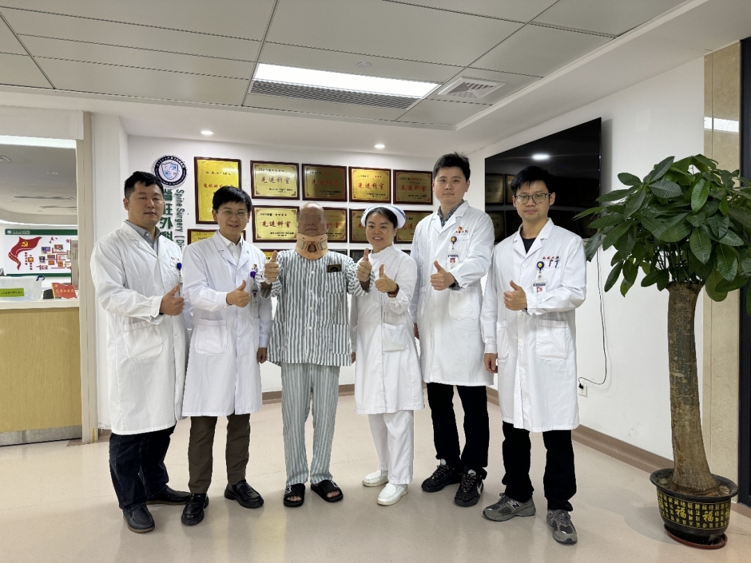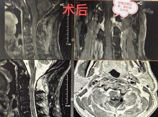 患者麻醉苏醒后,黄敏军第一时间到床边查看患者,检查患者的神经功能恢复情况,当看到患者用双手竖起大拇指点赞时,医护人员都松了一口气,手术成功了。术后两天,患者恢复下地自主行走,复查磁共振显示肿瘤被完整切除,严重受压的脊髓重新回归至正常中线水平。