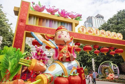 正门牌楼“幸福羊城新活力”主题景组采用财神、生菜、花生、鲤鱼等多达十几款的喜庆元素,展示传统喜庆特色。