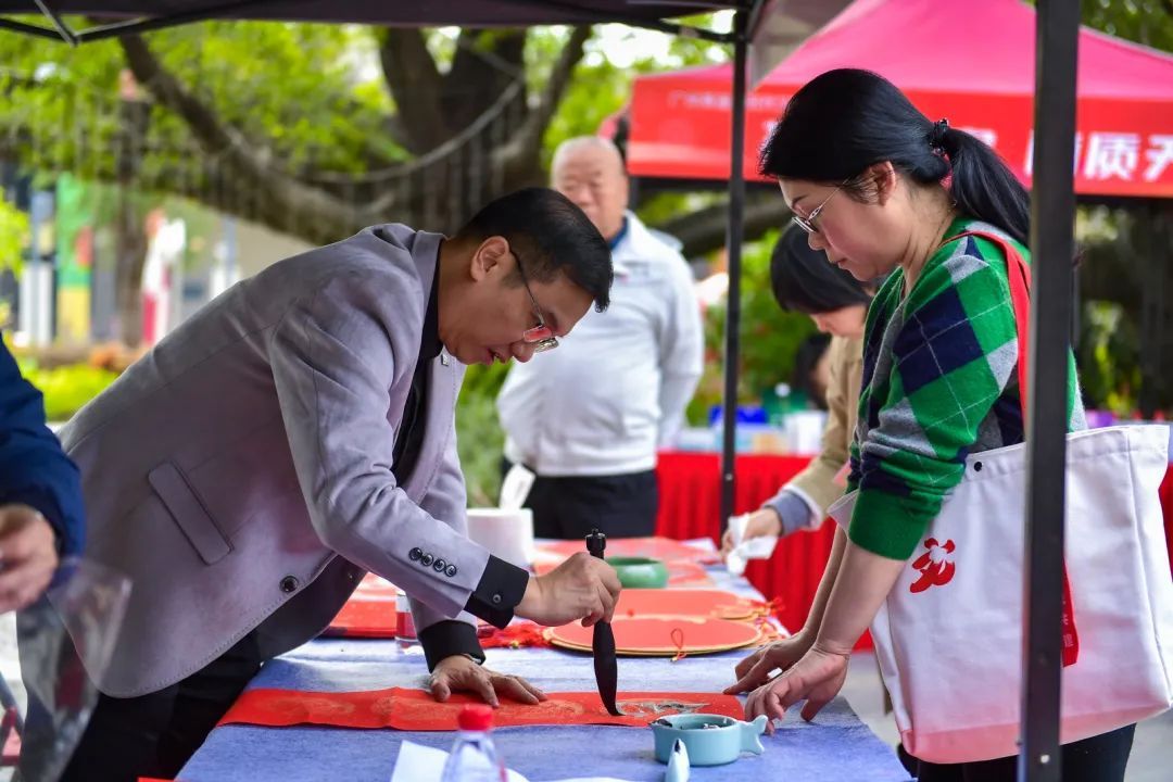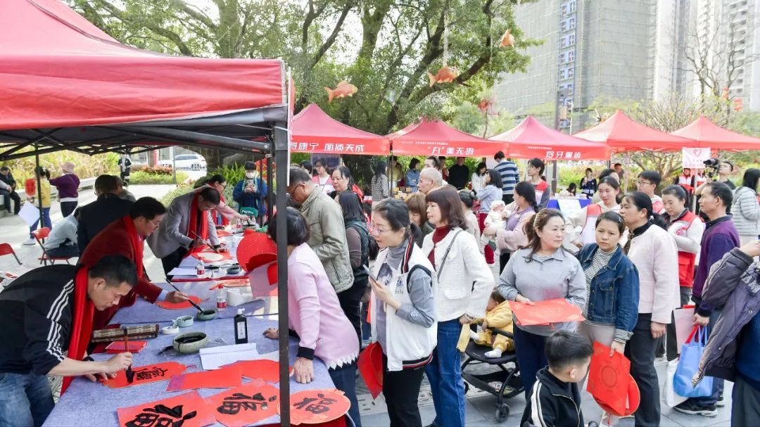 其他的摊位互动也同样精彩纷呈。非遗剪纸老师一面现场剪窗花,一面向市民讲解非遗剪纸的文化内涵,并向市民送上新年的美好祝福。在挥毫送福摊位,书法家们专注地书写春联,摊位前排满了等待领取春联的市民。“这个活动真的太好了,能拿到书法大咖写的春联,感觉特别有意义。”家住东荟城社区的梁先生领到了今年春节的第一副对联,开心地说道。