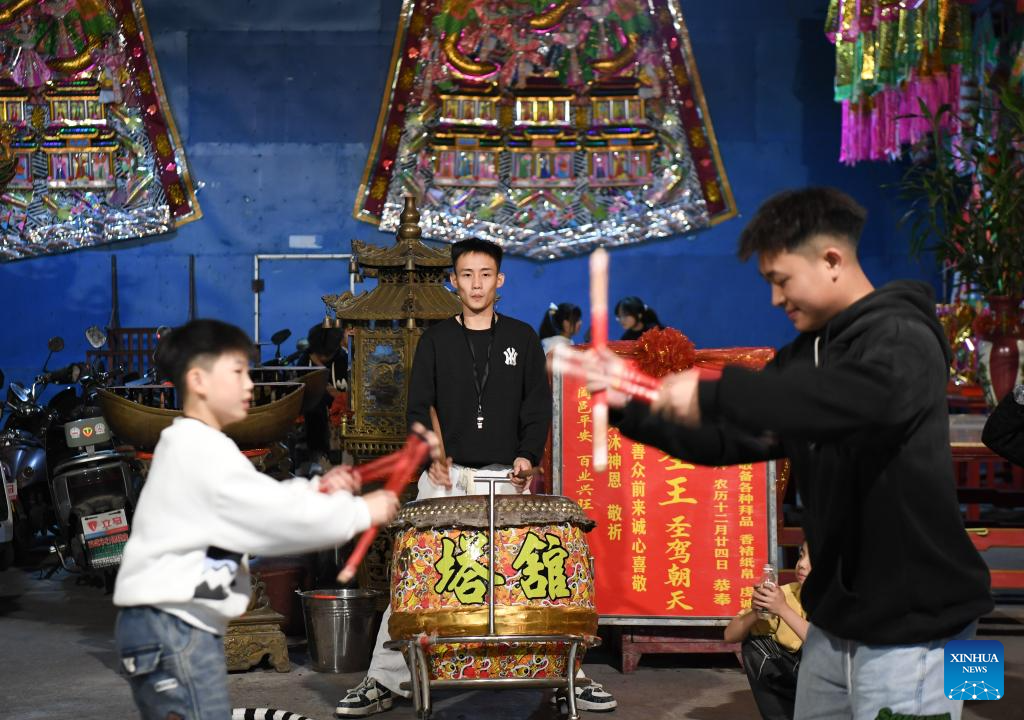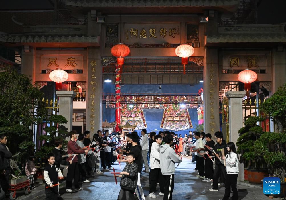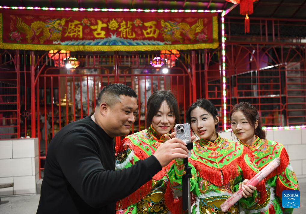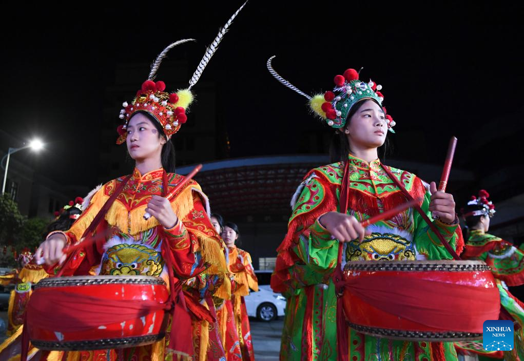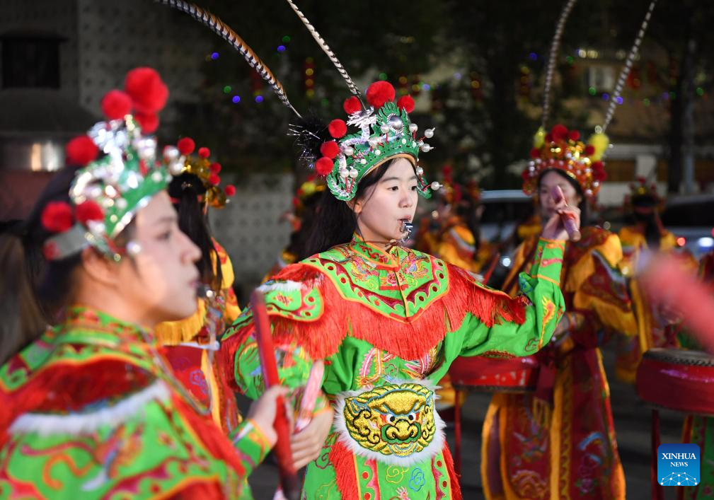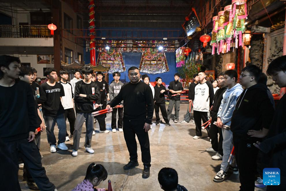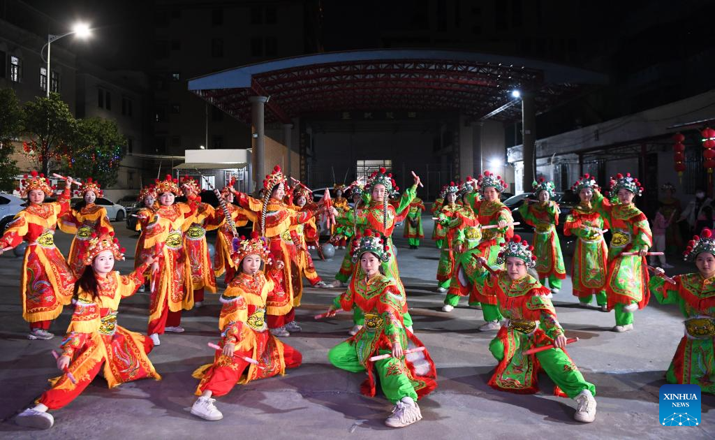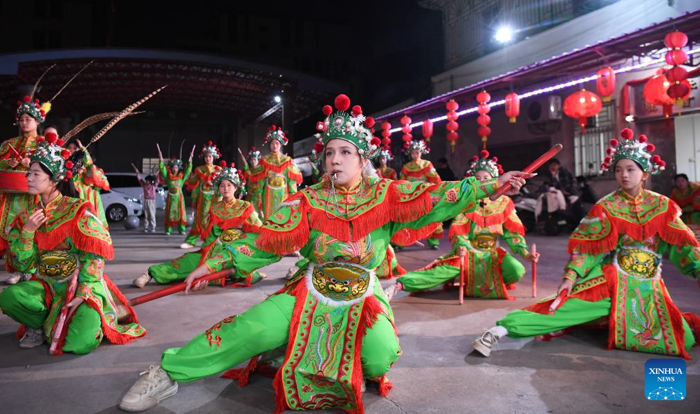 Members of an Yingge dance troupe perform during a rehearsal in Chaoyang District of Shantou City, south China's Guangdong Province, Jan. 21, 2025. (Xinhua/Deng Hua)