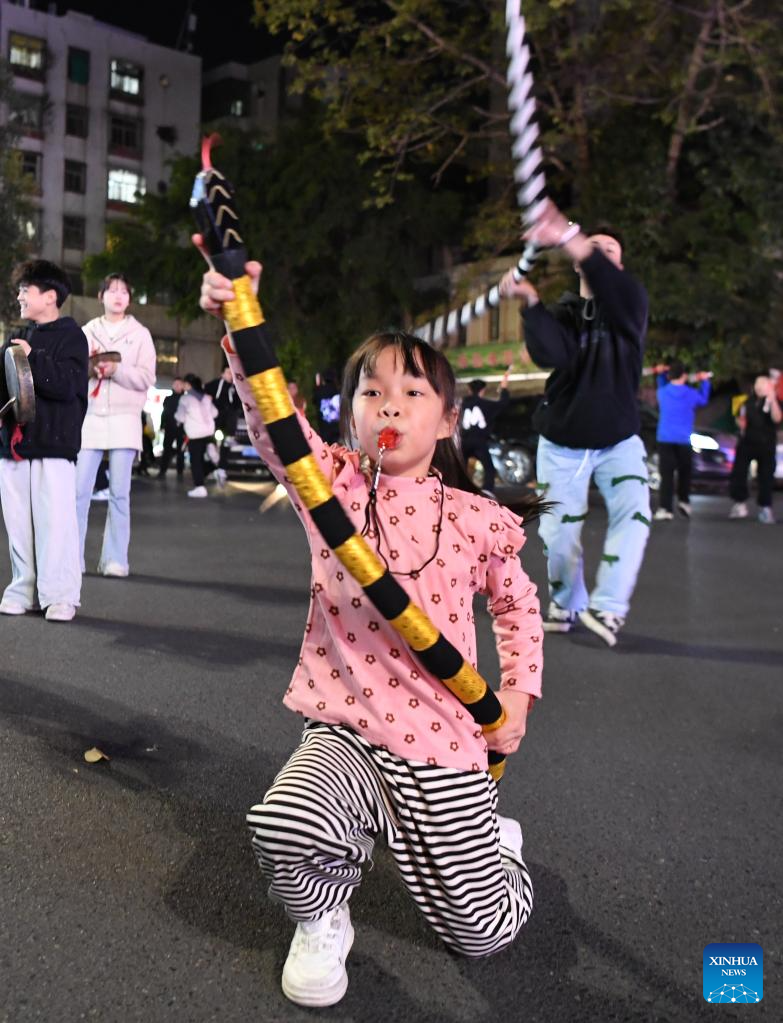 A young member of an Yingge dance troupe performs during a rehearsal in Chaoyang District of Shantou City, south China's Guangdong Province, Jan. 20, 2025. (Xinhua/Deng Hua)